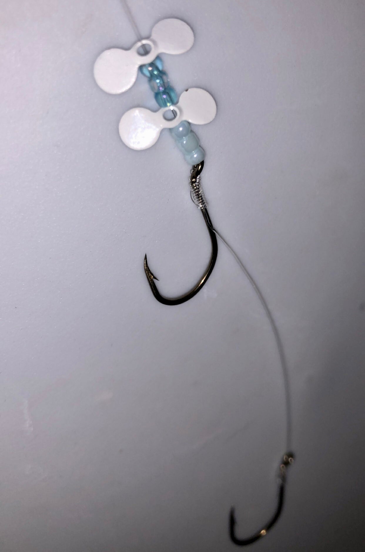 Tied with 14# Mono and two size #2 VMC Octopus hooks. Loop tied on the end for easier rigging.