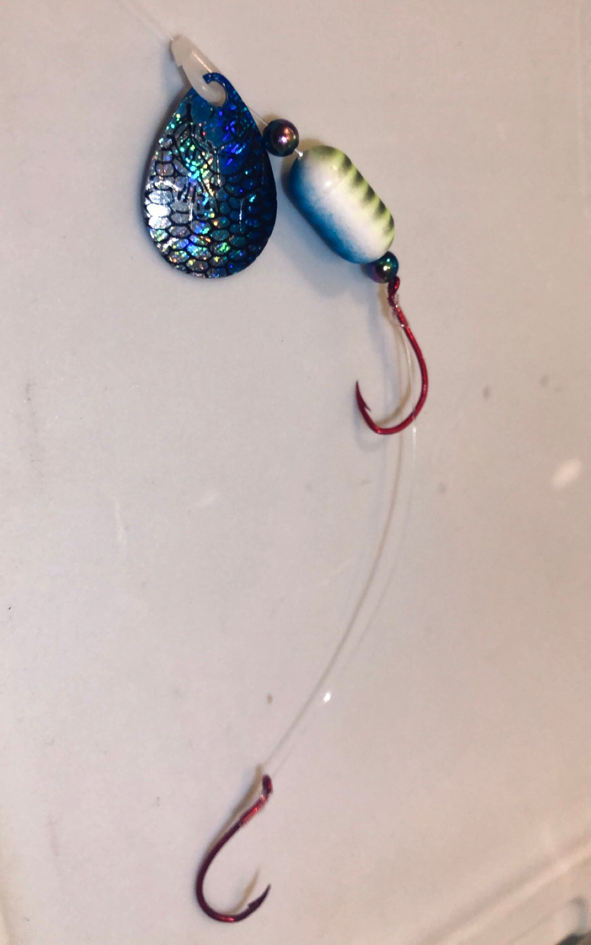 Tied with 15# Flourocarbon and #2 VMC octopus hooks. Loop tied on end for easy rigging.