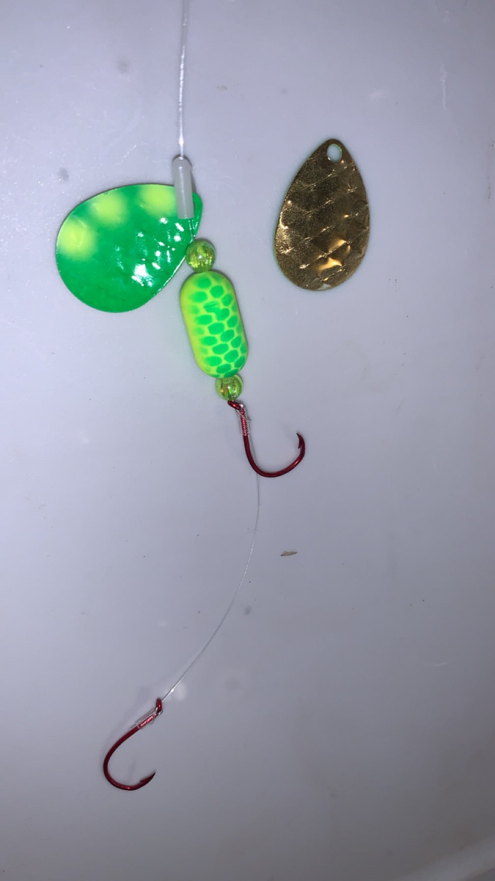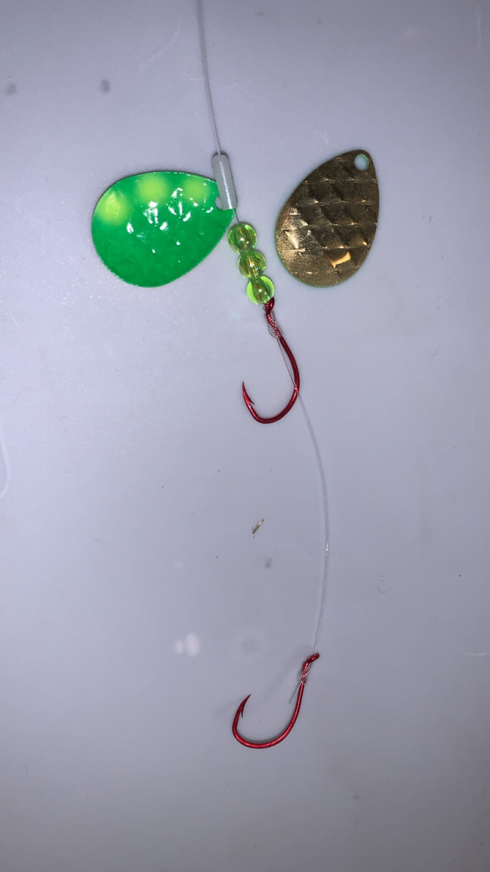 Tied with 14# Mono and #2 VMC octopus hooks. Loop tied on end for easy rigging.