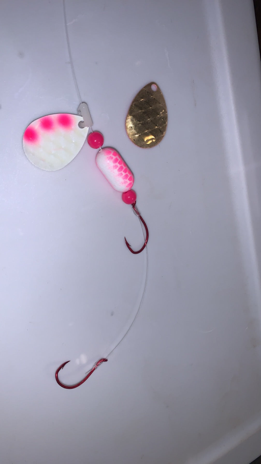 Tied with 14# Mono and #2 VMC octopus hooks. Loop tied on end for easy rigging.