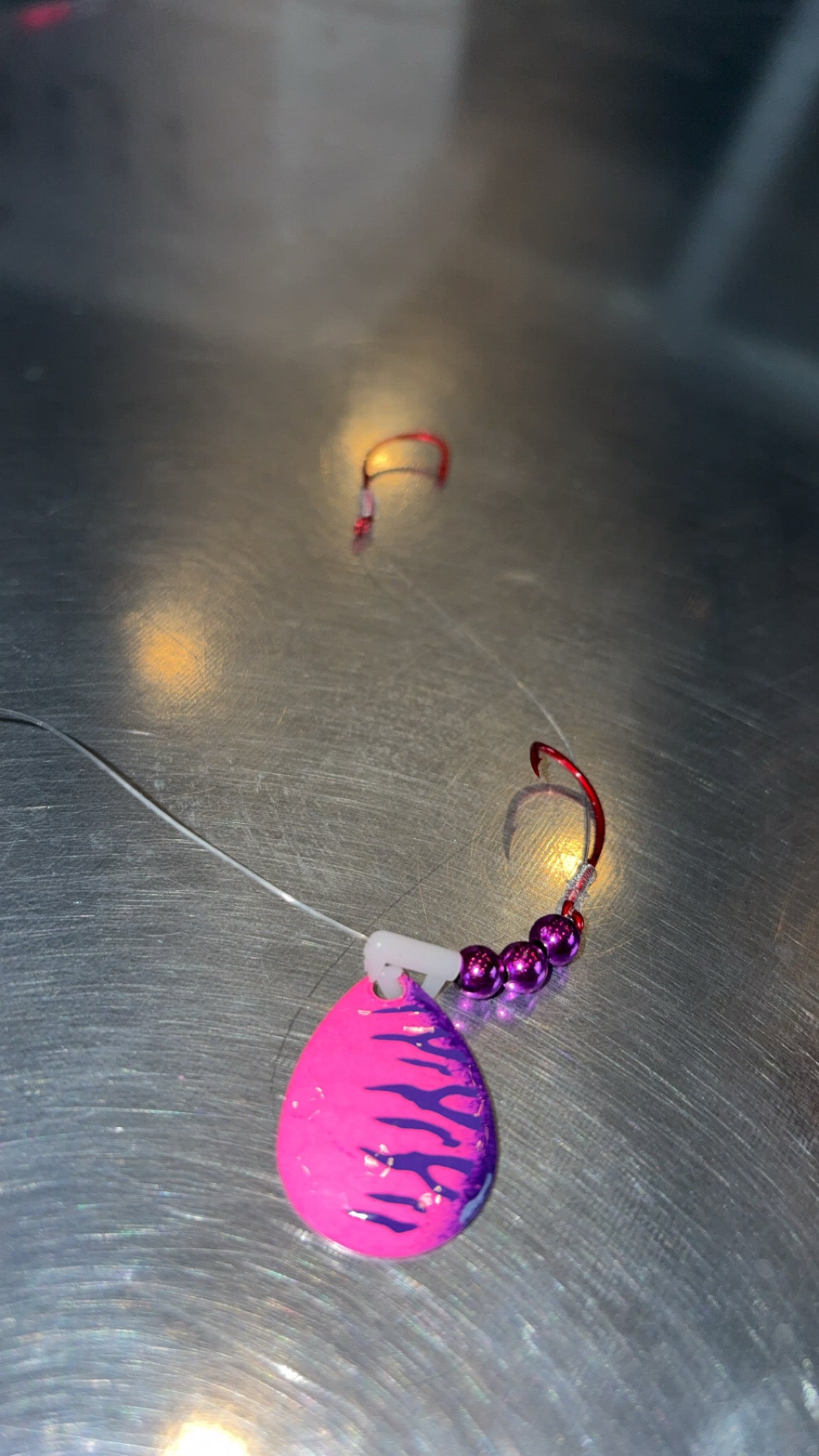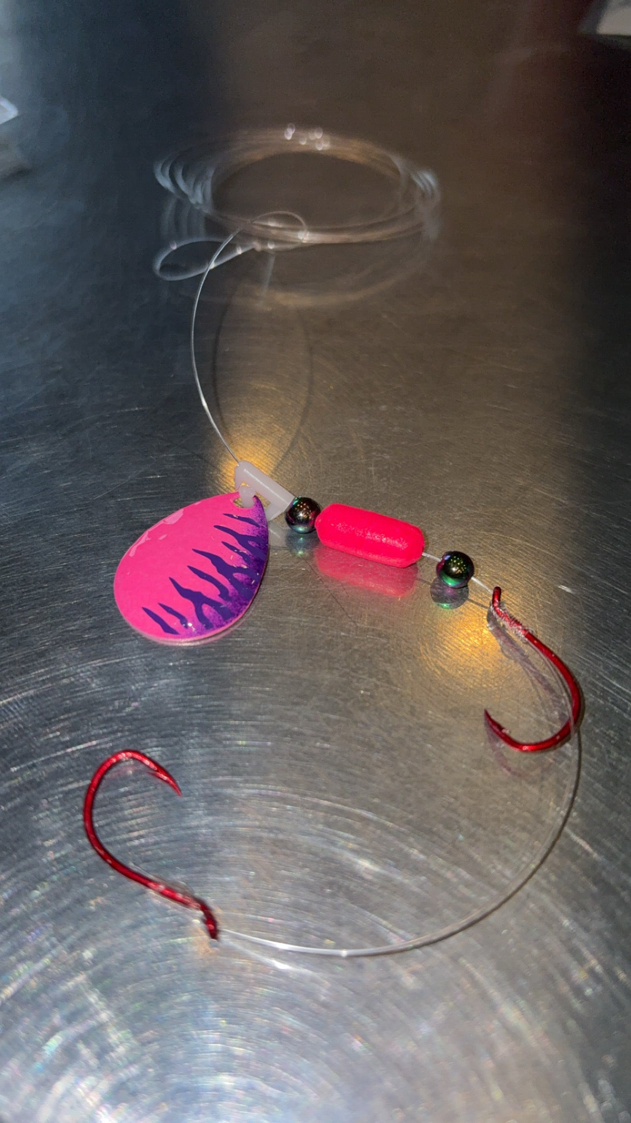 Tied with 15# fluorocarbon and #2 VMC octopus hooks. Loop tied on end for easier rigging.