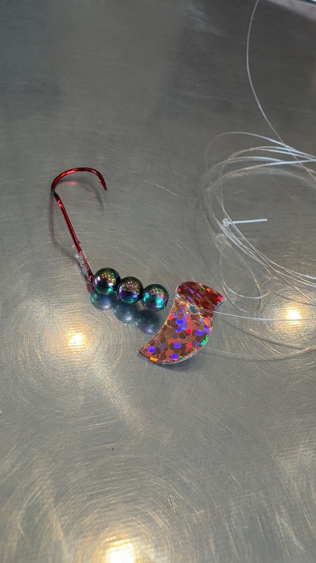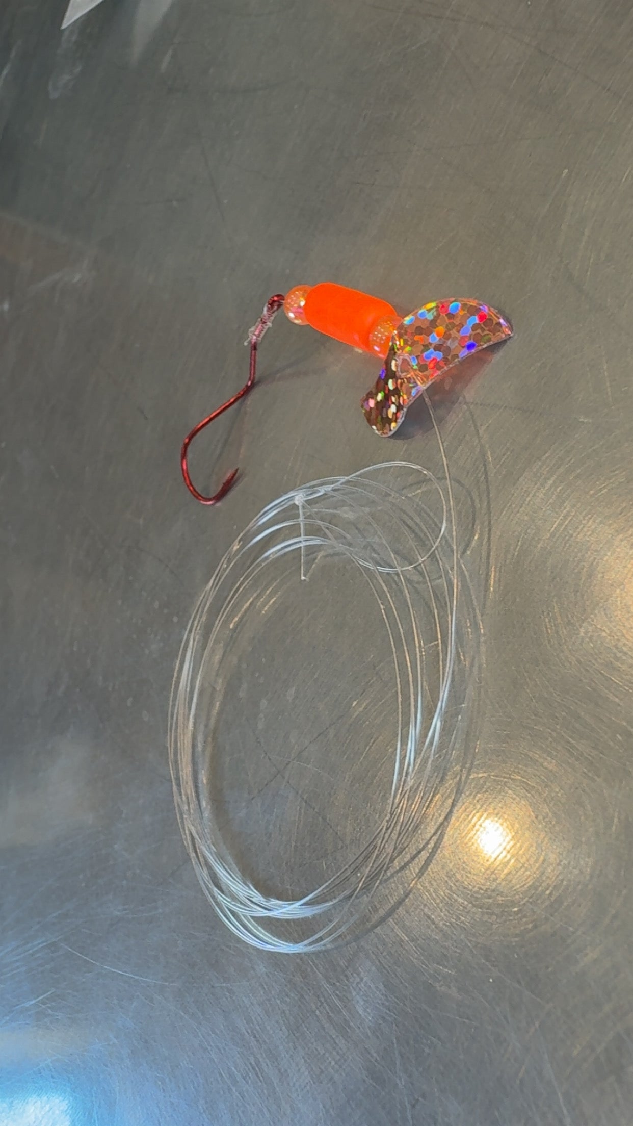 Tied with 15# Fluorocarbon and #1 Slow Death hooks. Loop added on end for easier rigging.